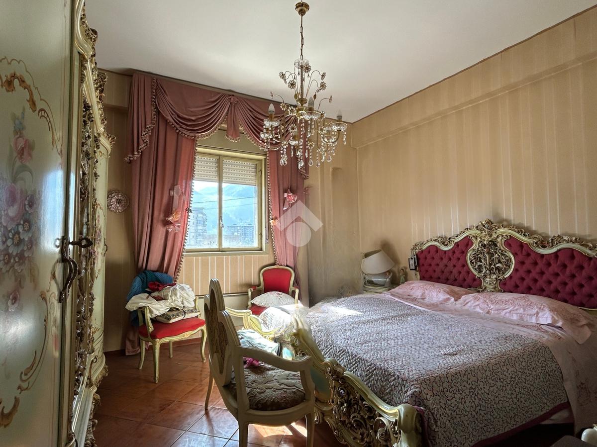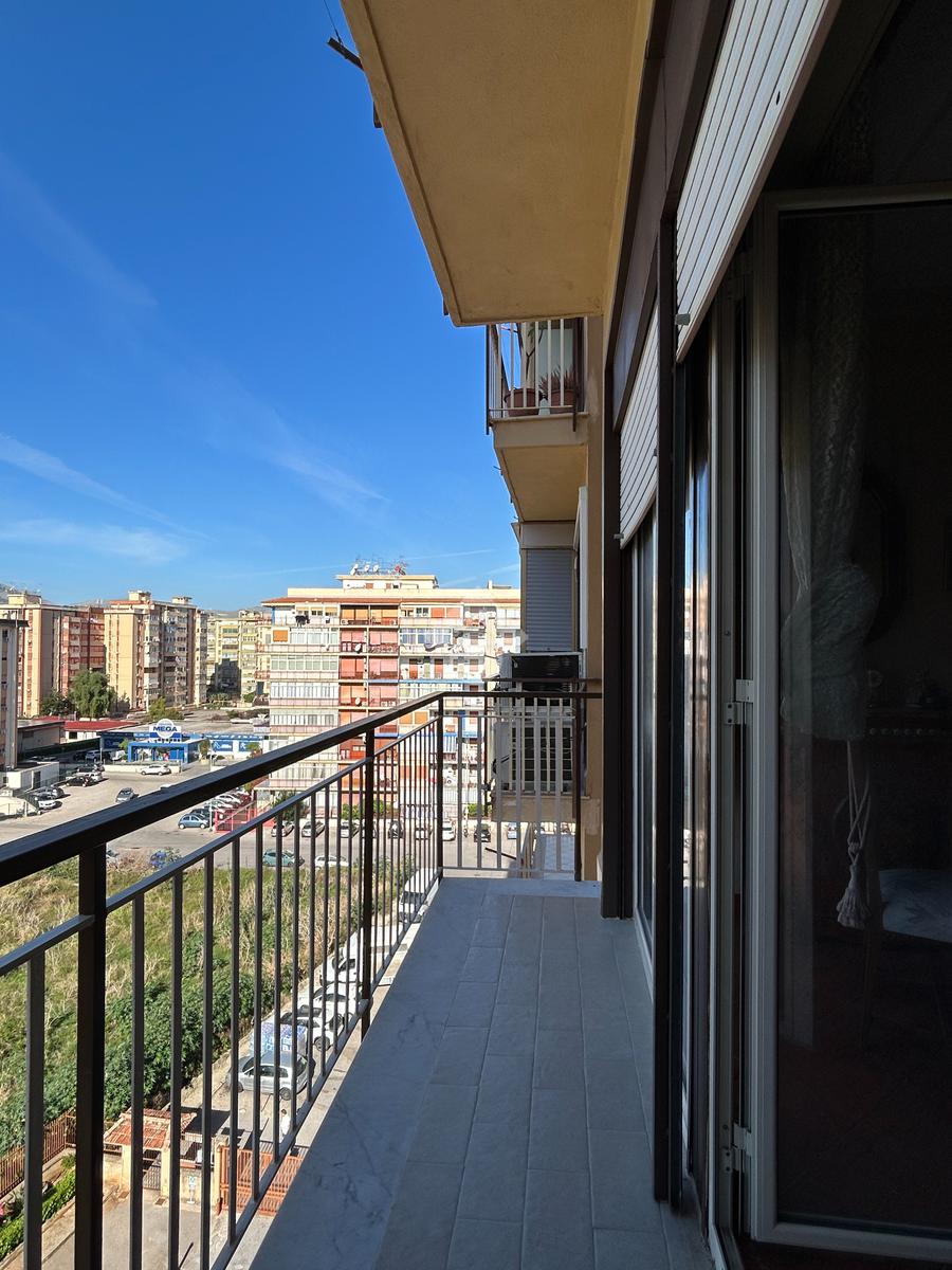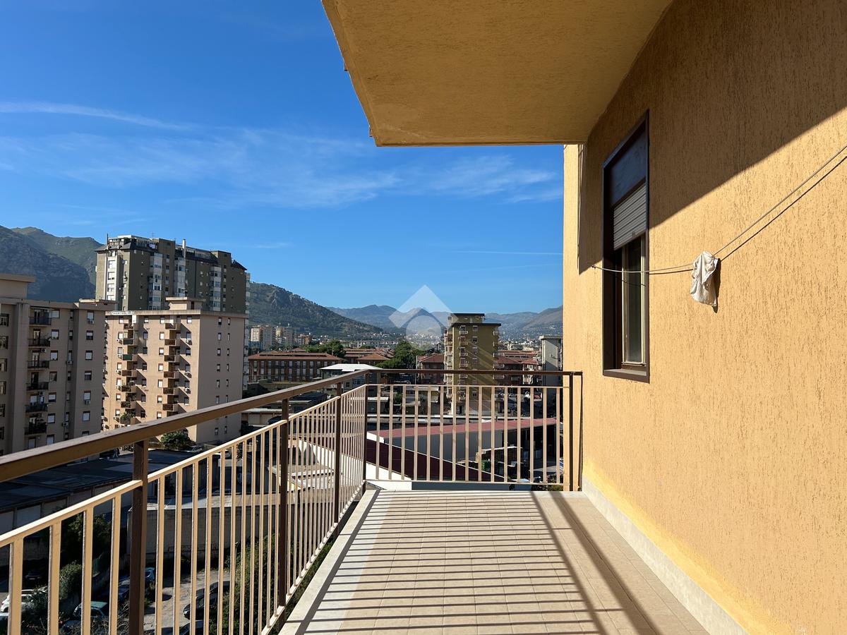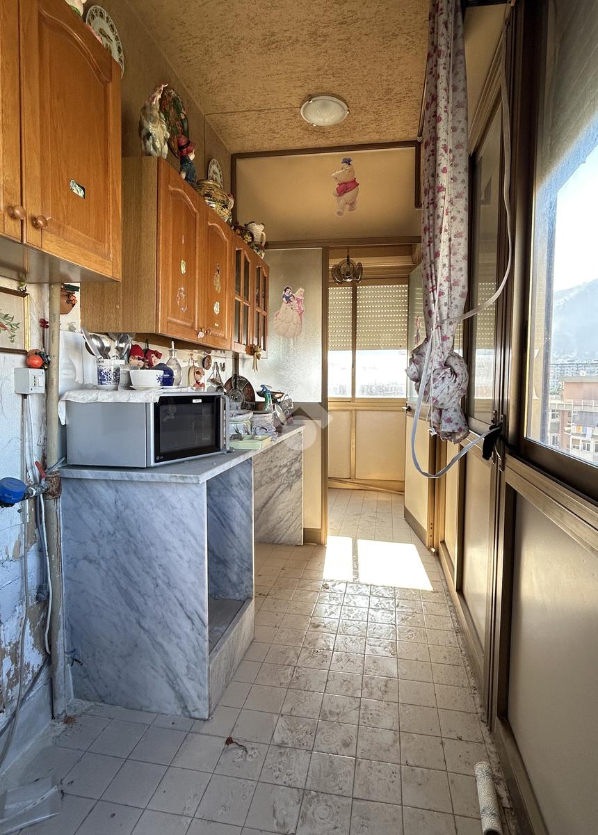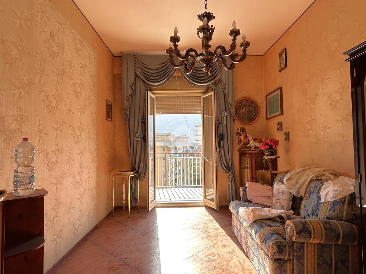 L'appartamento si estende su una superficie di 100 mq. ca. Tramite porta blindata l'ingresso conduce a un corridoio che disimpegna i vari ambienti. Sul lato destro troviamo l'ampio soggiorno di 25 mq. con accesso al primo balcone che espone sia sull'area condominiale che su Largo Vaiana e, adiacente al soggiorno troviamo la cucina semi-abitabile con accesso all'ampio balcone verandato. Sul lato sinistro, rispetto all’ingresso, troviamo la camera matrimoniale e la cameretta, questa con accesso al secondo balcone dal quale è possibile ammirare il panorama tipico della zona: tra palazzi e montagne.
